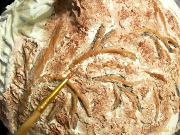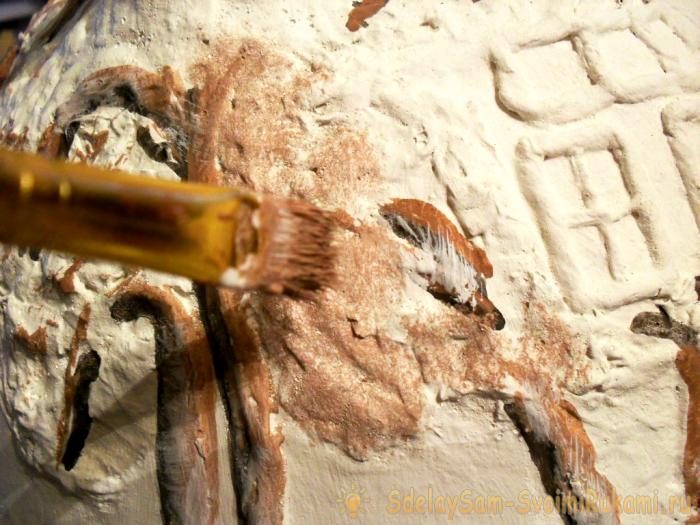 Затираем трещинки коричневой краской. Сушим.