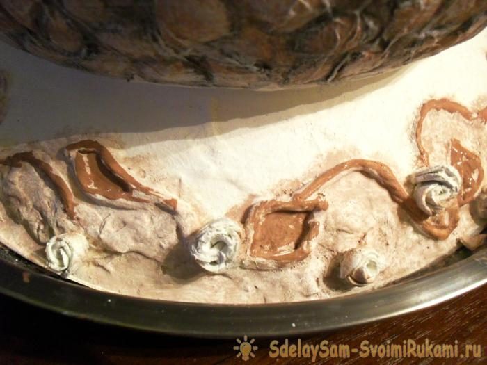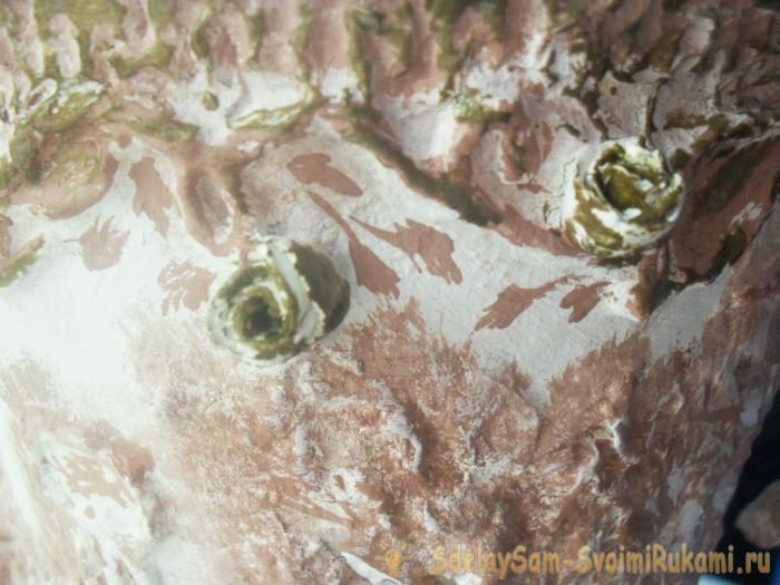 Для имитации каменной кладки используем яичную скорлупу. Клеем ПВА жидким густо покрываем небольшую часть поверхности вазы, на него прикладываем кусочки яичной скорлупы и обильно смачиваем ее снова ПВА. Сушим.