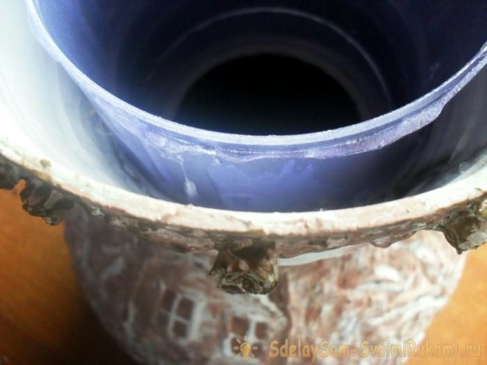 Для ширины горлышка можно использовать пластиковое ведро, предварительно обрезав дно. Для того, чтоб в вазу можно было наливать воду, крепим к цветочному горшку раскатанный брусочек холодной сварки. Закрепить его необходимо на такой высоте, чтоб вставленное внутрь пластиковое ведро упиралось в сварку. Заливаем внутрь «жидкие гвозди» (чтоб запечатать возможные трещинки и дырки)