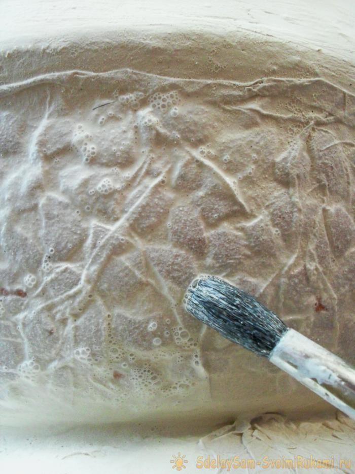Закрываем бинтом всю поверхность, двигаясь сверху вниз. Гипс необходимо смачивать сильно и всю поверхность, сразу же ее разглаживая ладошкой. Сушим день.