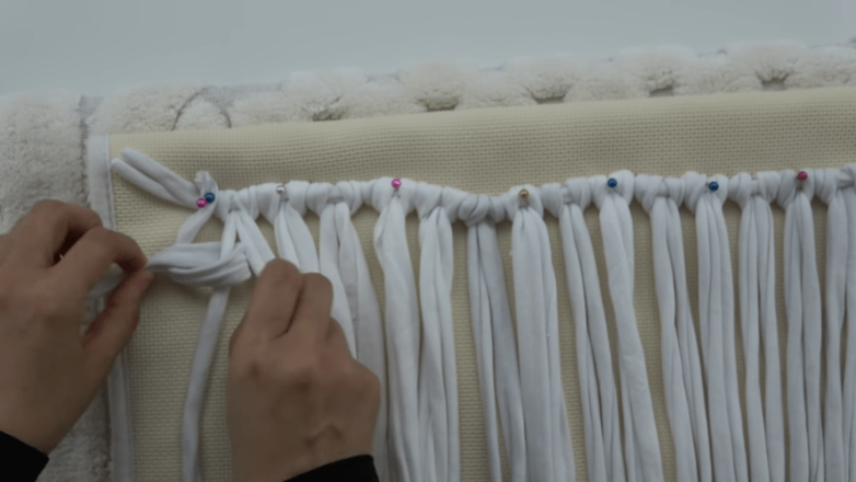 Чтобы оформить край, переворачиваем коврик, хорошо разравниваем и пускаем поверх нитей основы поперечный шнур. Дальше поочередно подгибаем кверху нити основы и пришиваем их к основному полотну. По окончанию работы обрезаем хвостики.