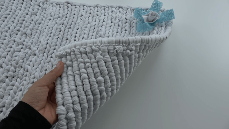 Используя обрезки с низа футболки, формируем декоративную розочку, а затем пришиваем к коврику вместе с бантиком из ленты. Коврик готов. Самое время найти ему достойное применение.
