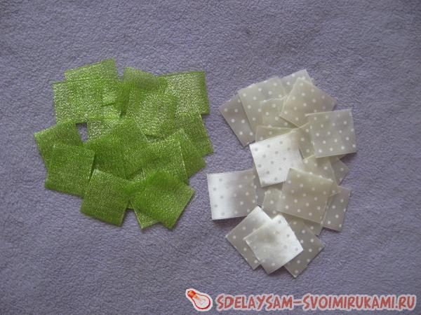 Нарезаем квадратики из парчевой ленты 4*4 см и из атласной ленты 35*35 мм. Нарезаем много квадратов из обеих лент и все их обжигаем по краям зажигалкой.