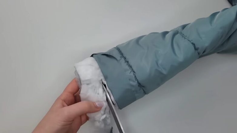 Отрежьте нижнюю часть рукава и раскрыв слои верхней и подкладочной ткани удалите наполнитель куртки.