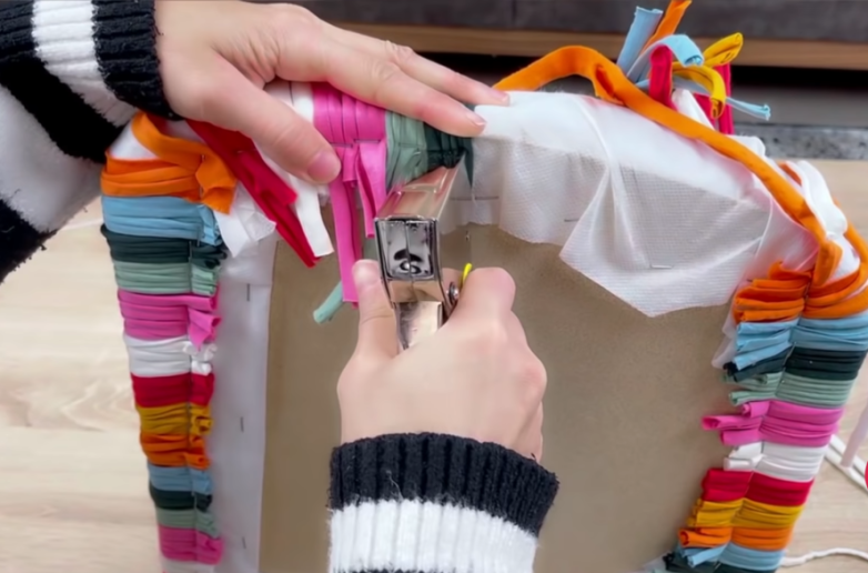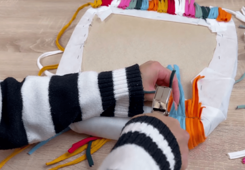 Концы здесь так же выводятся на тыльную сторону и закрепляются к основанию при помощи степлера.