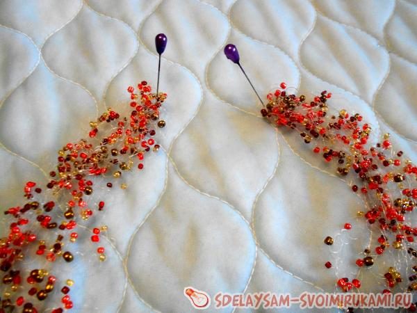 Собирать колье удобно на какой-либо мягкой поверхности, подойдет диванная подушка. Вкалываем в нее два ряда булавок. Расстояние между ними вниз– 1 см. В длину – необходимая ширина украшения. Но стоит учесть, что каждый следующий ряд должен быть длиннее на 1 см.