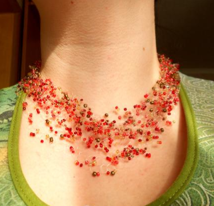 Это колье выглядит весьма необычно. Зачастую с первого взгляда даже сложно понять, как бусинки держатся вместе. При этом оно очень просто в исполнении. Можно не уметь вязать или не знать хитростей бисероплетения, но это украшения сделать за несколько свободных вечеров.