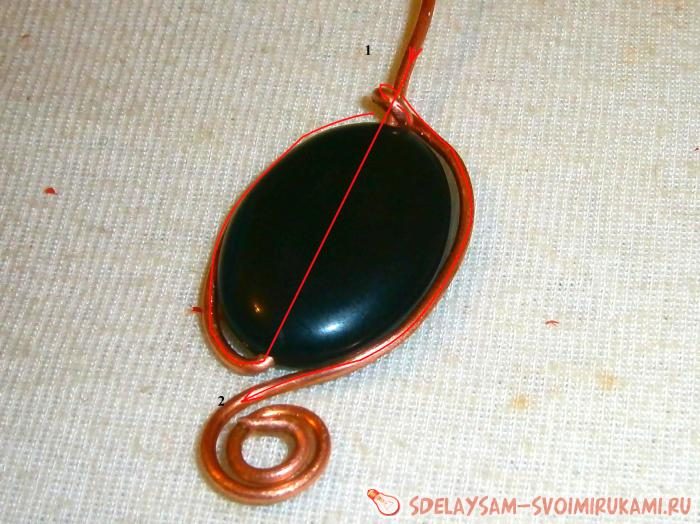 1. Сначала используем толстую проволоку для создания основы нашего кулона: для этого насаживаем наш камень черный гематит на проволоку, оставляем конец проволоки длиной 3 см и загибаем проволоку слева вокруг камня. Затем двигаемся из точки 1 в точку 2: для этого делаем петельку вокруг оставшегося свободного конца проволоки и загибаем проволоку справа от камня. Загибать можно и руками, поскольку проволока медная и достаточно мягкая. На конце круглогубцами заворачиваем красивый изгиб, как у скрипичного ключа.