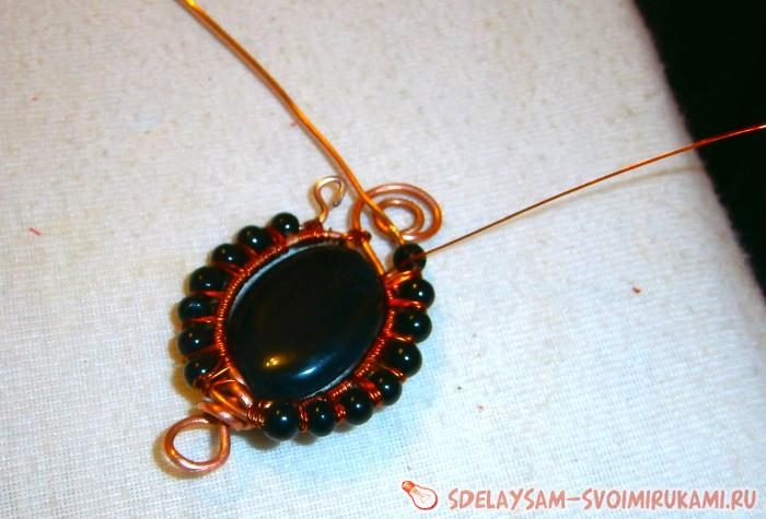 4. Теперь настала очередь проволоки потоньше: загибаем круглогубцами петельку у основания и нанизываем бусинки на неё. Самой тонкой проволокой крепим проволоку потоньше к основанию кулона 2-3 витками и для красоты под бусинами 5 витков.