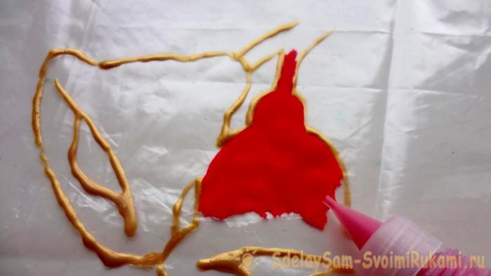4. Красную гелевую пасту и клей ПВА соединить и смешать до получения однородной массы. Наносить на рисунок лучше при помощи баночки с тонким носиком, но можно воспользоваться и кисточкой.