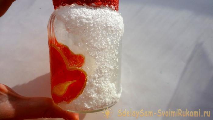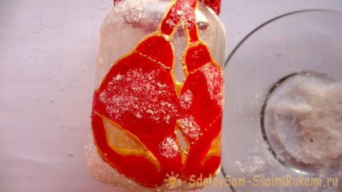 11. Нижнюю часть банки-подсвечника обильно мажем клеем и сверху посыпаем солью.