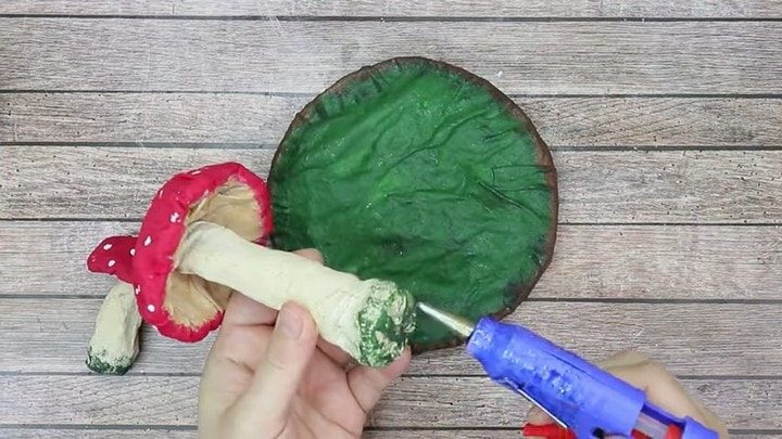 Возьмите кусок фольги и, сминая его, в соответствии с задумкой «вылепите» форму. В данном случае будет семейка грибов, а из фольги потребовалось сформировать ножки и шляпки.