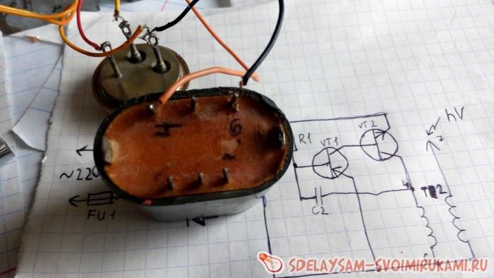 Важно, строчный трансформатор надо подключить правильно! Коллектор VT2 подключаем к 4 контакту.