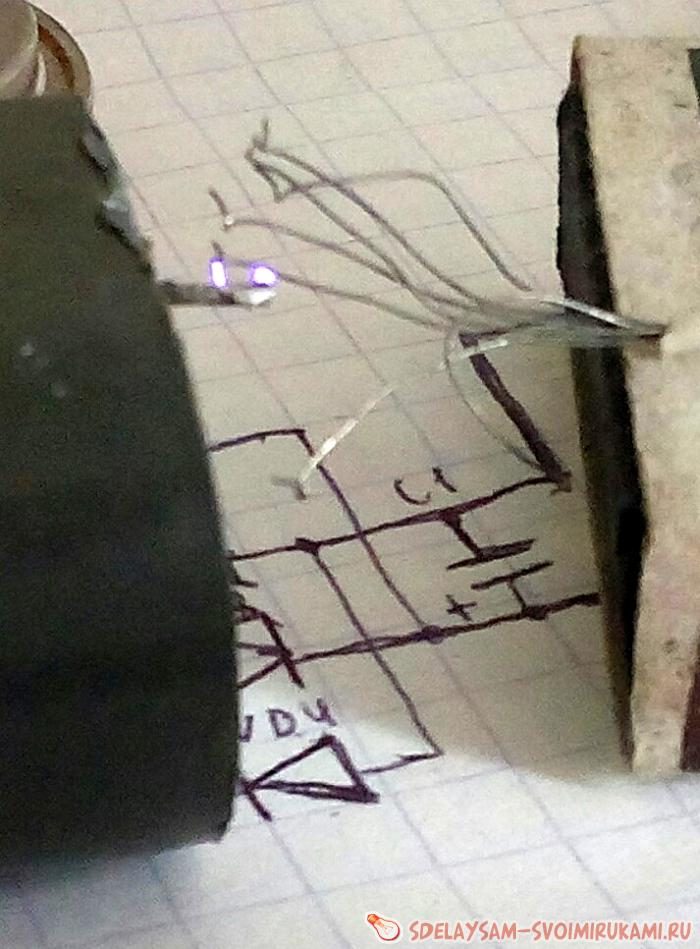 Как видим, в схеме задействовано минимальное количество деталей, что особенно важно для начинающих радиолюбителей, схему можно собрать навесным монтажом, что очень радует. А вот так выглядит собранная схема: