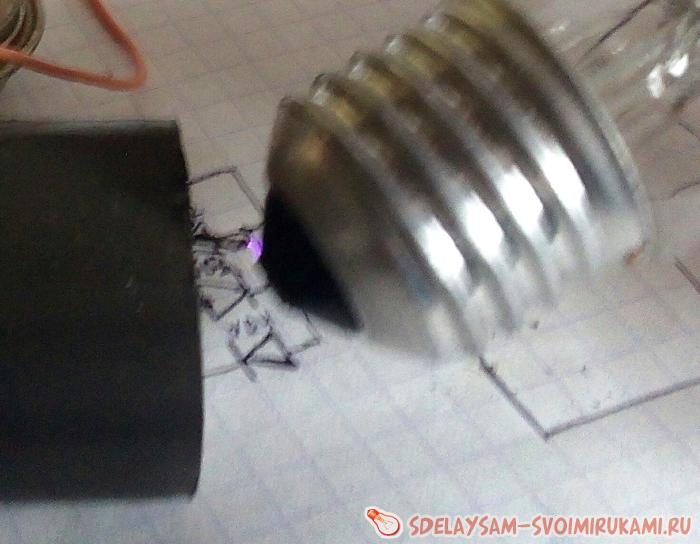 Когда всё готово, включаем трансформатор в сеть. При подведении к 7 контакту железных предметов появляются искры, с ними можно поэкспериментировать.