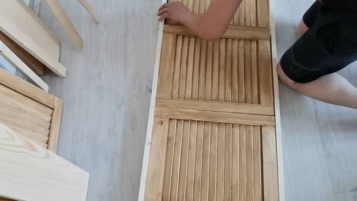Ещё понадобится деревянная жалюзийная дверь, которую также необходимо покрыть акриловой краской для влажных помещений. Из них делается простой щит для ванны: из реек собрать деревянный каркас, а уже на него закрепить дверцы.