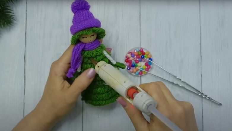 К деревянной бусине приклейте заготовку из зеленой пряжи — это будут волосы елочки, а затем зафиксируйте на голове шапочку.