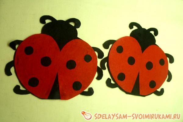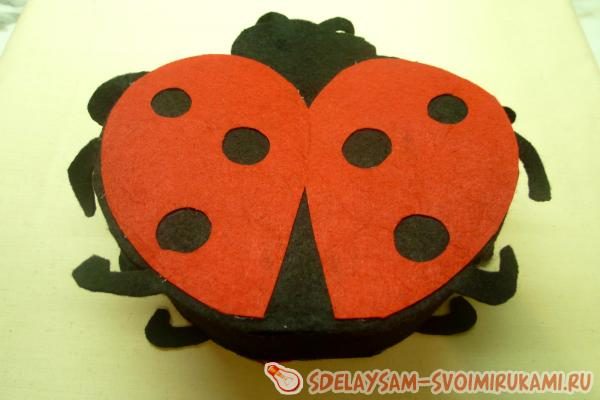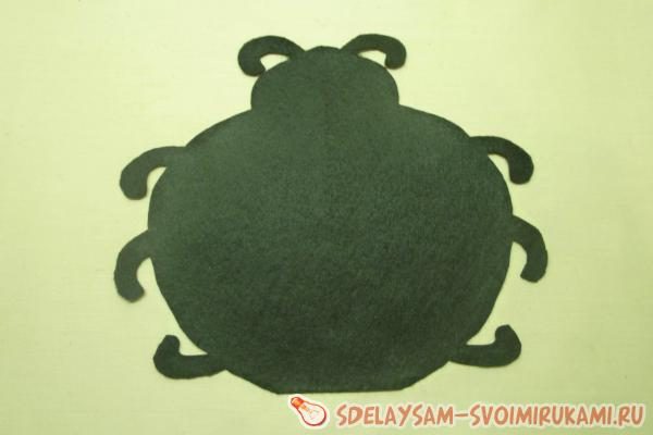 Основа сумочки, то есть туловище насекомого с лапками, воссоздается из черного фетра в двух экземплярах. Верхняя часть, имитирующая крылья божьей коровки, вырезается из красного фетра в таком же количестве.