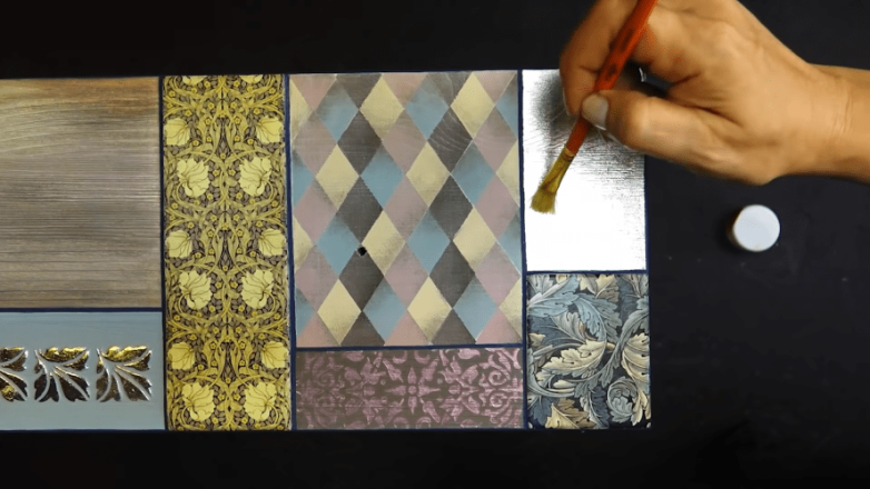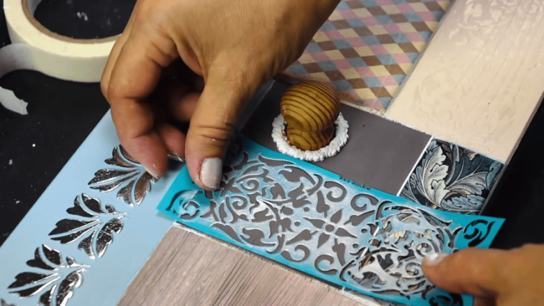 Интересно выглядят и объемные орнаментные вставки, покрытые патиной, для создания которых узорчатые отсеки трафарета были предварительно заполнены грунтовкой.