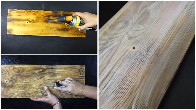 Все ящики разобраны. Самое время приступить к обновлению фасада. Средний ящик решено украсить отдельно. На обработку этой фасадной панели потребуется не менее суток. Работаем с оставшимися двумя. Для начала древесину слегка обжигаем. Затем берем металлическую щетку и нарочито расчесываем ей дерево с нажимом, чтобы получить глубокие борозды, через которые будет хорошо просматриваться фактура дерева. Окончив с брошированием, зачищаем поверхность и убираем мебельную пыль и опилки. Окрашивание проводим в несколько этапов. Сначала наносим слой обычной краски, используя сразу несколько пастельных тонов. Не дожидаясь полного высыхания, растушовываем краску по поверхности, воспользовавшись влажной тряпкой. В результате дерево тонируется, а переходы становятся более мягкими. Сверху наносим еще один слой обычной краски, даем немного подсохнуть и покрываем еще одним слоем. Теперь используем не обычную краску, а «хамелеон». Благодаря этому высохшая поверхность будет переливаться и эффектно выглядеть при разных вариантах освещения.