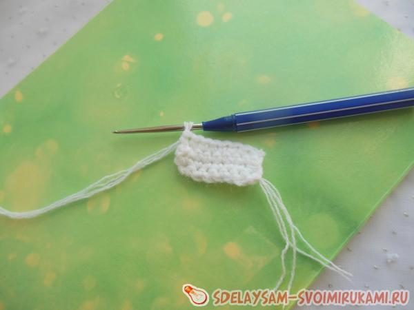 Белые цветочки начинаем вязкой цепочки из 9 воздушных петель (в. п), каждую петлю которой повязываем столбиком без накида (ст./б. н). Всего необходимо провязать 4 ряда плотно посаженных столбиков.