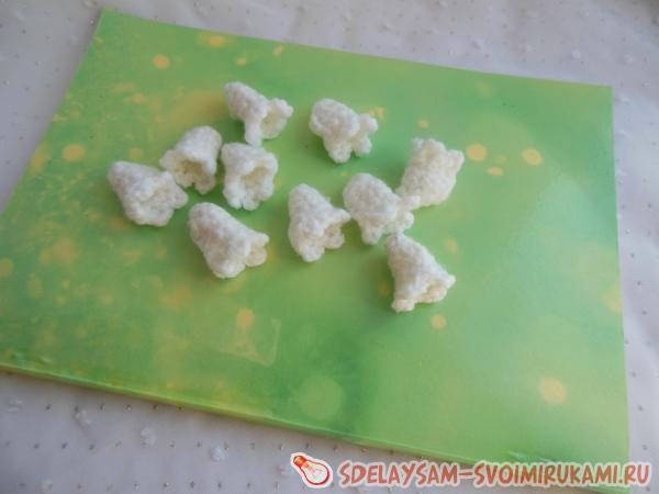 Затем складываем эту цветочную заготовку пополам и попарно обвязываем боковые и верхние стороны соединительными петлями. Так мы получим цветочки в форме колокольчиков.