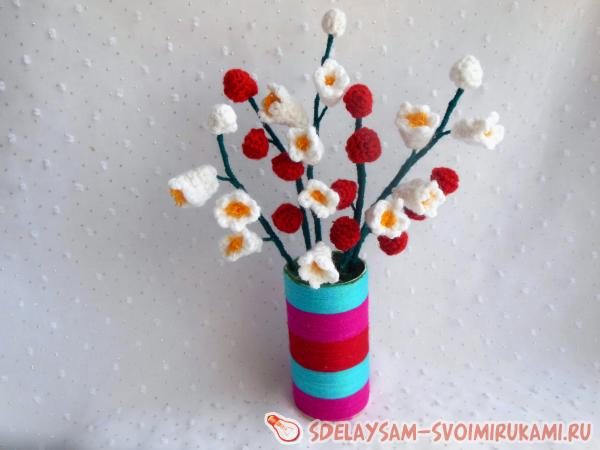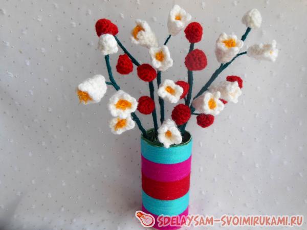 Создать подобную композицию легко. Достаточно иметь белый, жёлтый, красный и зелёный клубки тонкой пряжи, крючок для вязания 2.00 мм, наломать тоненьких веточек для стеблей и подготовить немного медной проволоки.