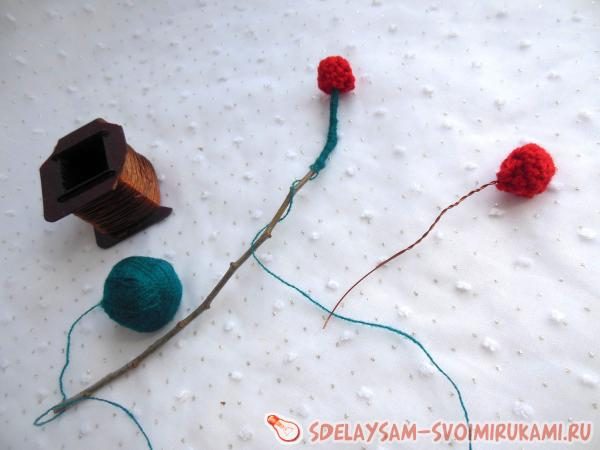 Крепить как ягодки, так и цветочки будем с помощью проволоки. Сначала немного обматываем верхний конец ветки зелёной пряжей, «надеваем» на кончик первую ягодку/бутончик и приступаем к её последовательному наполнению.