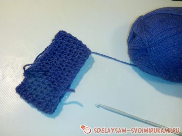 13 ряд — провязываем перед сгибом 2 петли вместе, затем на месте сгиба обычный столбик с накидом, затем 2 петли вместе. Далее вяжем до второго сгиба и повторяем убавление в том же порядке. Таким образом, в 13 ряду убавляется 4 петли. Провязываем столбики с накидом до первого сгиба.