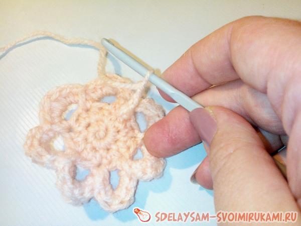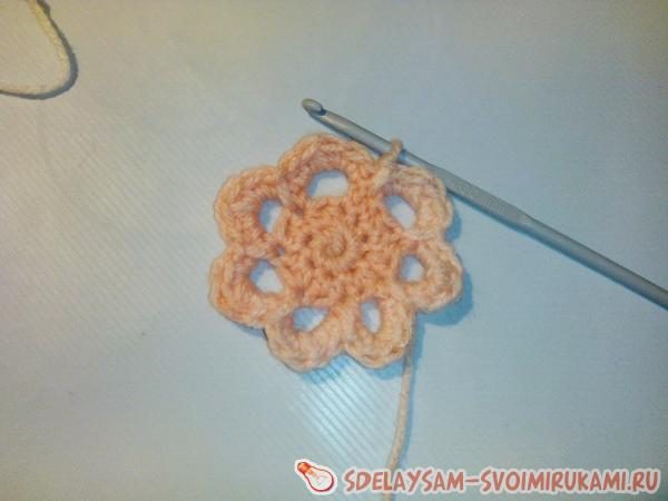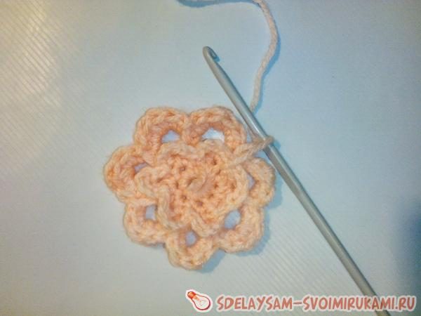 Затем выправляем нитку на лицевую сторону вязания и провязываем в центре такое же количество арок из воздушных петель, затем провязываем каждую арку столбиками без накида. Получаем второй ярус цветка. Таких цветочков готовим четыре штуки.
