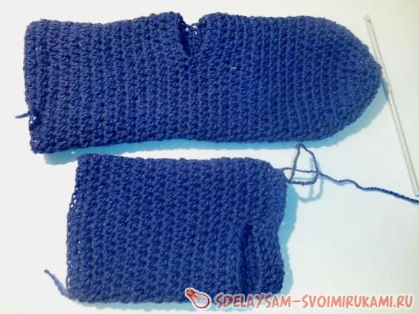 Теперь необходимо предусмотреть отверстие для большого пальчика. Пропускаем 8 петель нижнего ряда, провязав столько же воздушных петель над ними. Соединяем следующую петлю с нижним рядом, и вновь продолжаем вязать по кругу столбиками с накидом на всю длину ладони и 2/3 длины пальцев. Для нашей модели это 12 рядов.