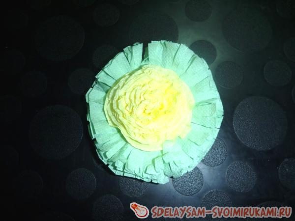 5. Следующий шаг – сбор соцветия. Для этого каждый слой салфетки, начиная с верхнего, прижимаем к центру. Здесь главное аккуратность, поскольку тонкие салфетки могут порваться. Листья тоже можно согнуть, но необязательно. Так цветы будут казаться более пышными.