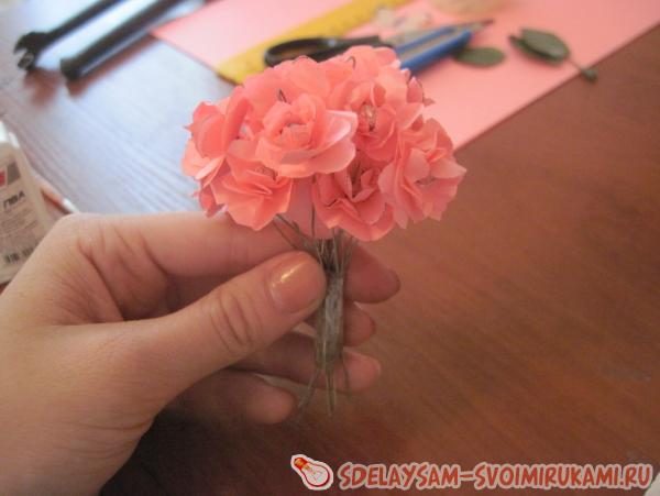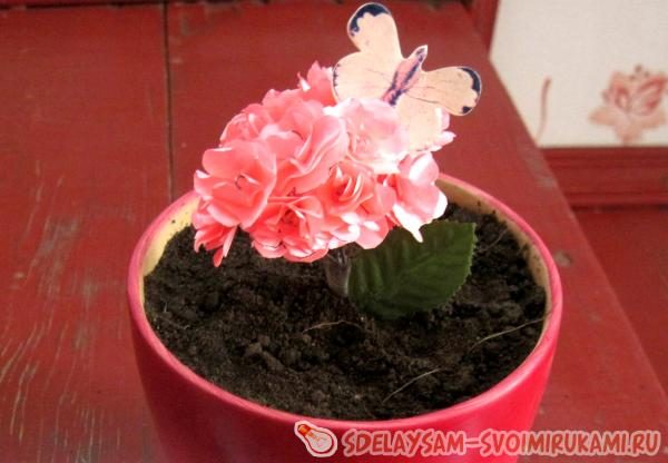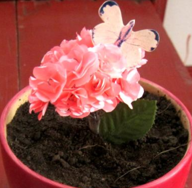 8)Делаем нужно число цветочков. При помощи скотча закрепляем их в букет. Свой цветок я посадила в горшок для цветов и украсила.