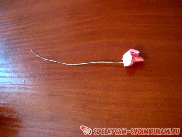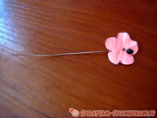 6) При помощи плоскогубцев отрезаем проволоку длиной 8см. Это будет стебель. Надеваем на проволоку бисер или бусинку и закрепляем, чтобы она не упала.