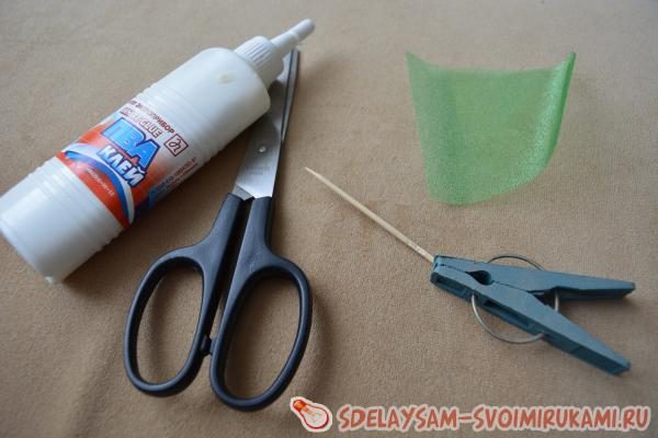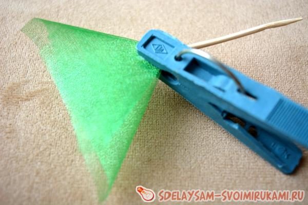 Шаг4. Делаем фунтики из органзы для украшения. Нарезаем много маленьких квадратов из органзы, примерно 5 на 5 сантиметров, опять же, исходите от размеров вашей корзинки. Сворачиваем из квадрата органзы равнобедренный треугольник дважды и прикрепляем каплей клея к зубочистке. В этом очень помогут бельевые прищепки. Прижимаем прищепкой место соединения и ждем полного высыхания, иначе органза будет отклеиваться от зубочистки. Еще лучше вместо обычного ПВА клея использовать строительный клей, он сохнет быстрее и скрепляет гораздо лучше!