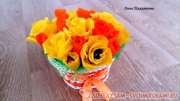 Предлагаю несложный мастер-класс по созданию маленькой корзинки без ручки с чудесными яркими желтыми и оранжевыми розами.