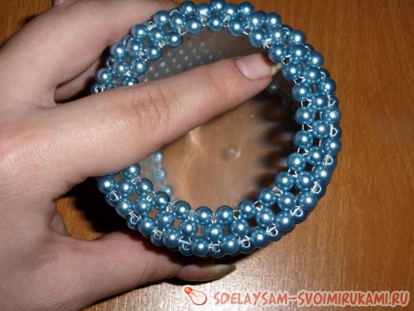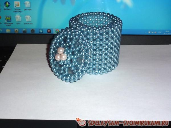 Кстати, я решила не заморачиваться в поисках нужной емкости и, просто, использовала баночку из-под ватных палочек. Следующим шагом сплетаем полотно в браслет. Для этого добавляем по одной бусине и стягиваем в петли края полотна.