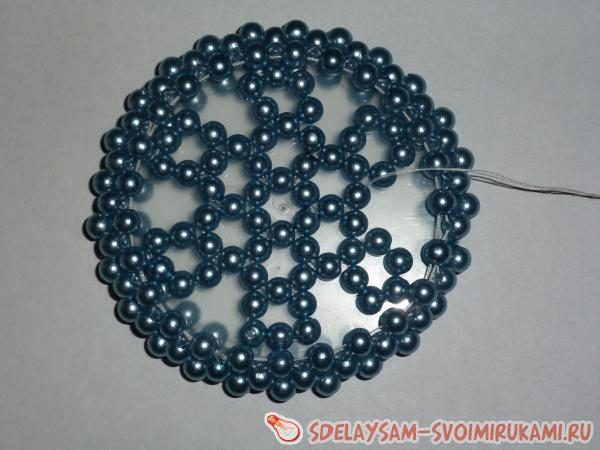 Теперь, берем нитку, и, продевая иглу в каждую крайнюю бусину основания, немного стягиваем их к центру дна.