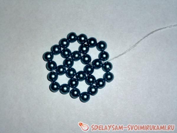 Затем набираем на нитку еще 5 синих бусин и замыкаем их в петлю с одной из синих бусин среднего кольца.