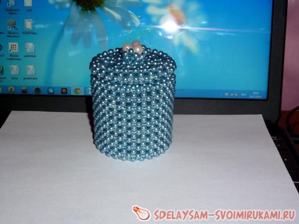 Теперь уже нужно будет добавлять не по 3, а по две бусины, так как теперь используются еще и боковые бусины первого ряда. Так, ряд за рядом плетем полотно до тех пор, пока оно не станет намного выше нашей баночки.