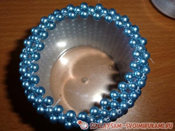 Для того чтобы привести ее в нужное красивое состояние, снова плетем цепочку из бусин, которая по длине будет совпадать с окружностью крышки.