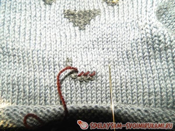 Этой же темно-серой ниткой вышиваем глаза и носик у кота. Вышиваем крестиком глаза и носик, как показано на фото. Можно сразу связать глаза, нос и рот в процессе всей вязки – привязывать нитку, отсчитывать петли, потом путаться в этих нитках. Я посчитала, что так дольше и поэтому уже на готовой шапочке крестиком вышила мордочку. Теперь этой же ниткой вышиваем усы у кота. Дальше берем бордовую нитку и также по картинке вышиваем ротик у нашего котика.