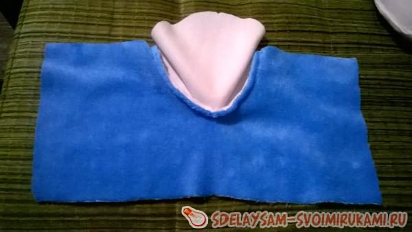 10. Теперь начинаем собирать остальные детали. Берем деталь из велсофта, совмещаем с носком, но уже без синтепона.