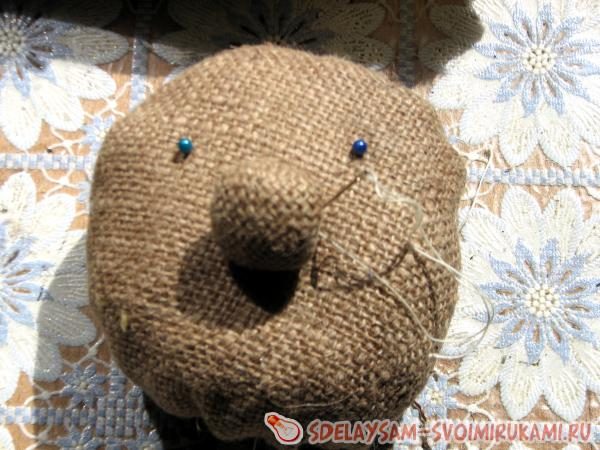 Крепим нос по середине лица головы при помощи иглы или клеевого пистолета. Намечаем места расположения глаз и приклеиваем их.