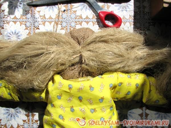 5. Формируем волосы из пакли. Для этого берем сноп пакли и перевязываем его пополам. Крепим при помощи клея на затылке. Равномерно распределяем по голове домовенка при надобности используем клей. Аккуратно состригаем лишнее. Одеваем шляпку.