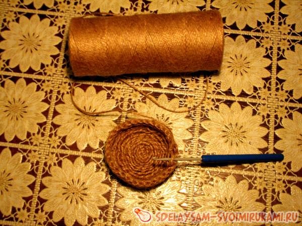 4. Вяжем лапти и шляпку из бечевки. Их можно приобрести в магазинах фурнитуры или подарочных. Одеваем их на домовенка.