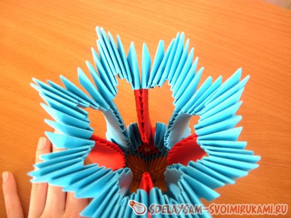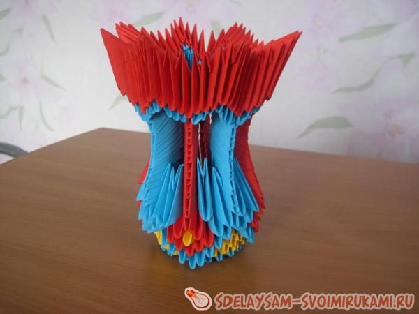 Теперь собираем верхушку вазы. Надеваем модули так, как показано на рисунке. Затем поверх этих модулей надеваем модули красного цвета.