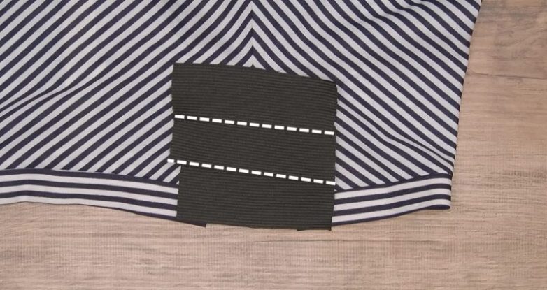 Это позволит создать необходимую эластичность. Вырежьте из резинки трапециевидный клин. Обтачайте края швом зигзаг, чтобы предотвратить осыпание ткани.