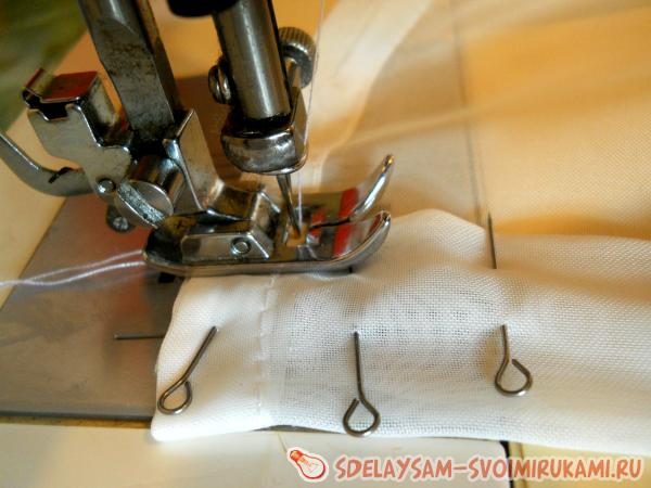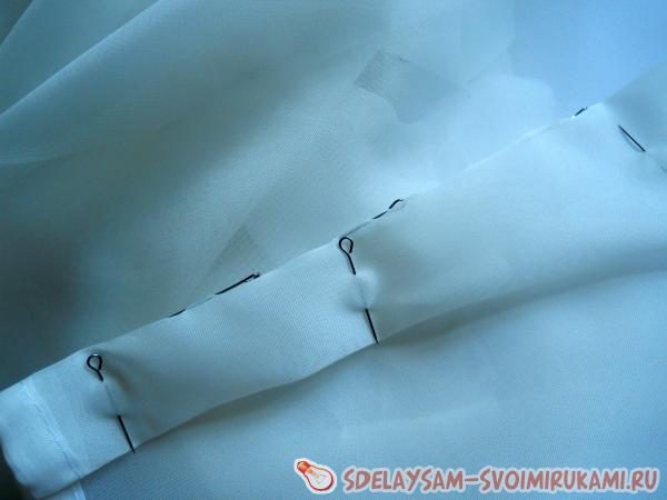 Снять штору, разложить её на чистом полу. Линейкой замерить, на сколько будет укорачиваться вуаль. Подвернуть её по всей длине, закрепив иголками.