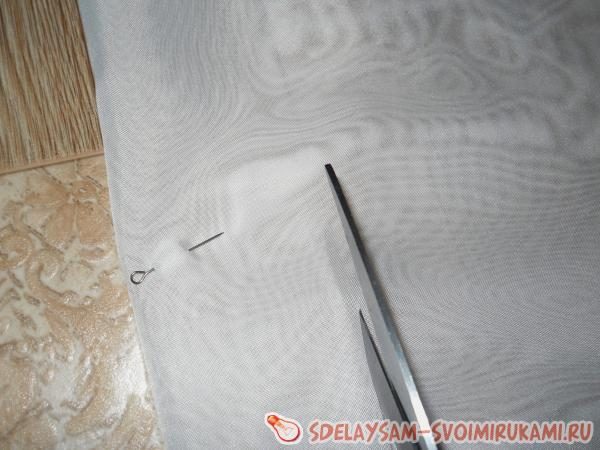 Отрезать лишнюю ткань, отступив от сгиба на 5 см. Вуаль легко ровно отрезать, если напольное покрытие имеет прямые линии. Эта ткань очень тонкая и хорошо просвечивает линии на полу, которые можно использовать вместо линейки. Если такой возможности нет, то нужно маркером для работы по ткани отложить от сгиба с помощью линейки 5 см по всей длине вуали.